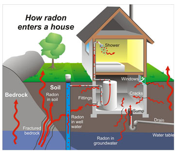 Radon is a radioactive gas that has been found in homes all over the United States. It comes from the natural breakdown of uranium in soil, rock, and water and gets into the air you breathe. Radon typically moves up through the ground to the air above and into your home through cracks and other holes in the foundation.